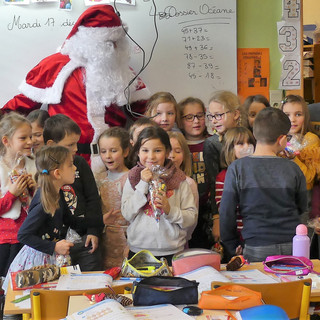 Chaque année, le père Noël se dépêche de venir offrir aux enfants de l’école un petit cadeau, certes c’est un peu en avance, mais comme les enfants sont en vacances à partir du 20 au soir, il a tenu à venir avant leur départ. Il a commencé sa tournée par les enfants de maternelle puis il est passé dans chaque classe élémentaire .